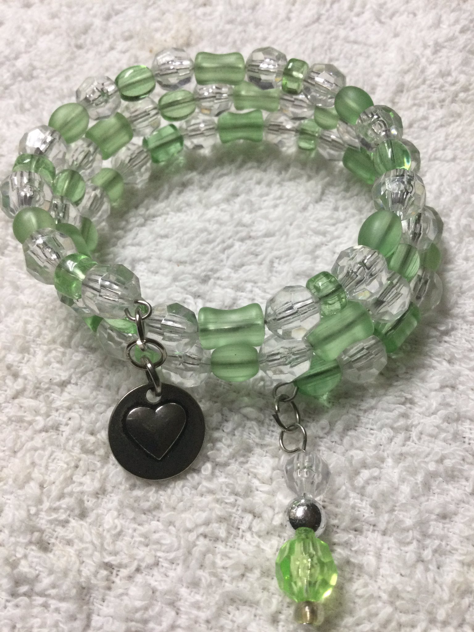 Memory Wire made on small wire but will expand to fit most larger wrist. Made with Glass and Acrylic Beads